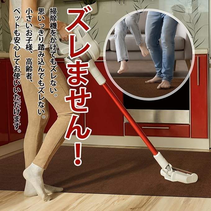 3、【おすすめのところ】★置くだけでマットの裏面がピタッと床に吸着します。掃除機をかけても吸い上がりません。何度でも貼り直しができ、床にべたつきも残りません。★厚さ0.4cmの薄型なので、つまづきにくく、ドアの開閉を邪魔しないので場所を選ばずに設置できます。