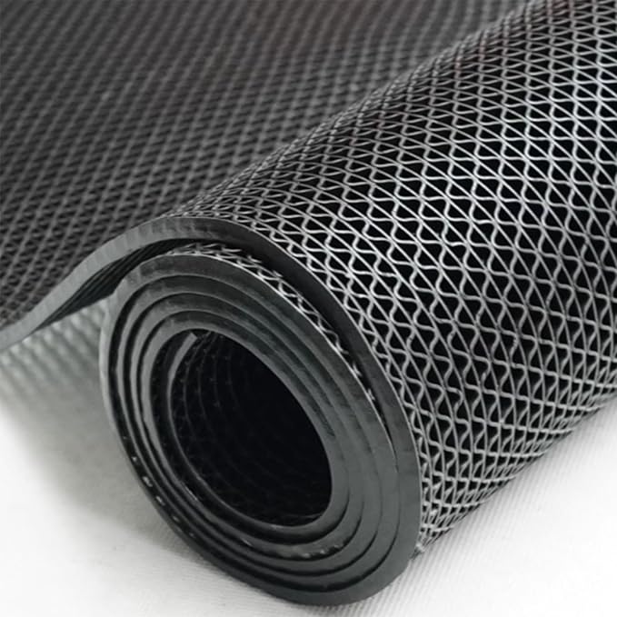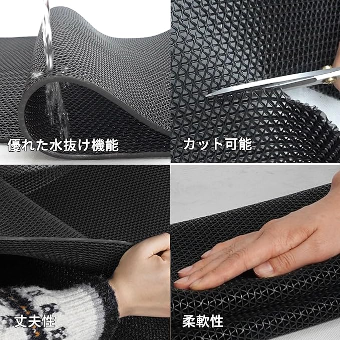 【全面水抜け形状】マット全体がメッシュ状で水が抜けていく構造。足の下に「水の層」が発生しにくく、滑りの原因を大きく低減します。