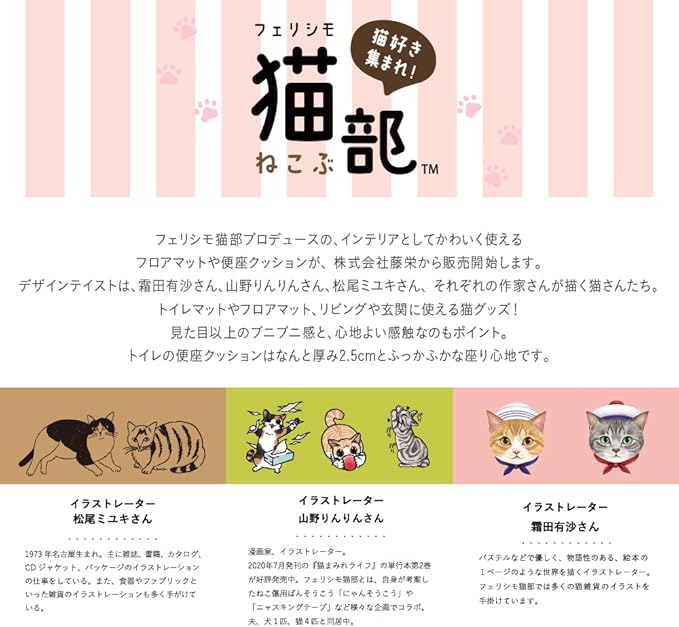 【猫のかわいらしいデザイン】フェリシモ猫部プロデュース。イラストレーター松尾ミユキさんのかわいらしいデザインで玄関やトイレ、廊下、リビングを飾ります。
