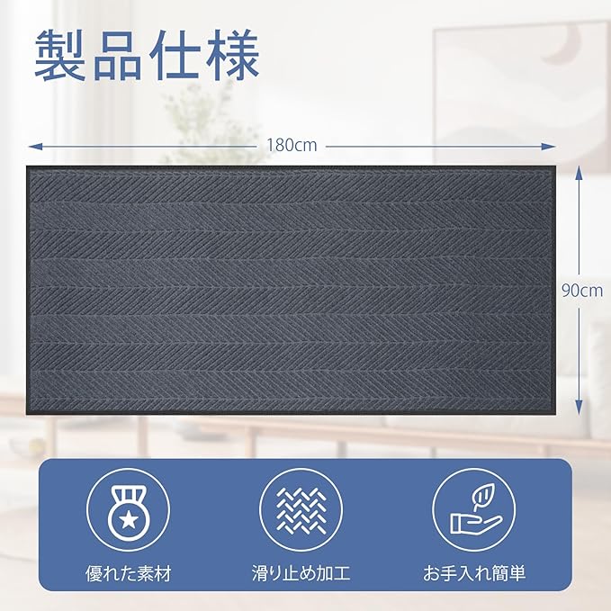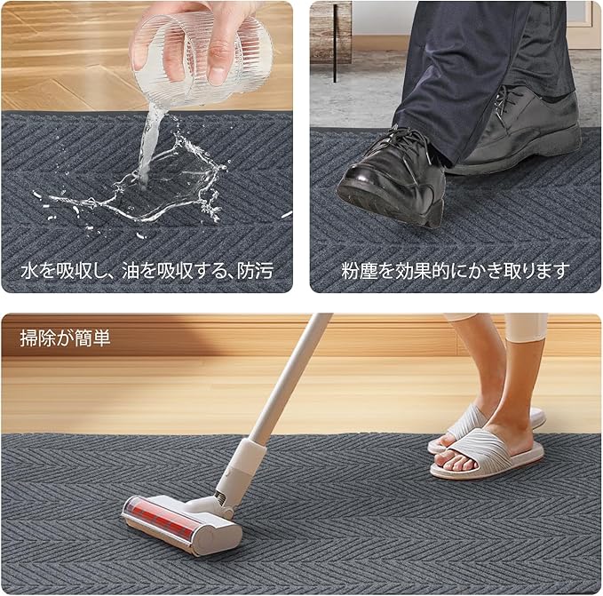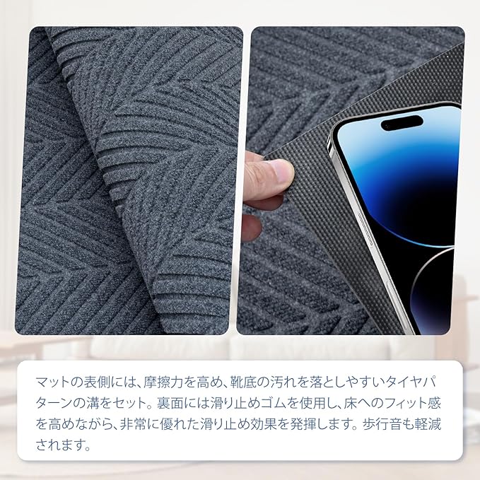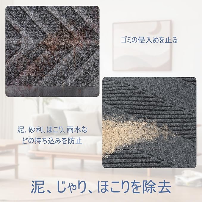 泥落としと吸水性滑り止め機能:表面の凹凸構造で靴裏に付いている埃や砂、傘に残った雨水などを効率的に取りますマットの裏にも滑り止め加工を施しましたので、子供とお年寄りがいるの家庭でも安心してご利用いいただけます