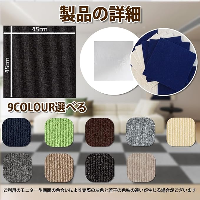 【防音保温・4mmの厚み】4mmの丁度いい厚さ、熱伝導性に優れ、夏場はしっかり通気、冬場は床暖房の熱がしっかり届きます、オールシーズン対応。タイルカーペッ ト表層の織物の生地は柔らかく、手触り感が良い、また防音効果もあり、騒音を生じることが効 果的に防げます。防音効果もあって、ペットやお子様が走り回る足音や掃除機をかける音などの生活音も階下に伝わりにくくなります。
