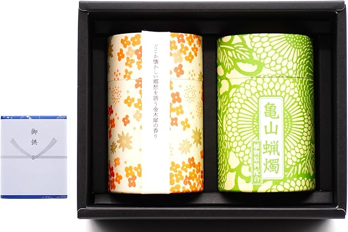 伝統の「菊唐草柄」をモダンにアレンジした、和遊ブランドの10分ローソクシリーズ。 原料にこだわり、ススはほとんど出ず、環境に配慮したローソクです。 エコカラーの芯糸の緑が特長です。秋の少し冷たくなってきた空気にふわりと香る金木犀(キンモクセイ)。 どこか「懐かしさ」を呼び起こす香り。商品を包装し、仏事全般でお使いいただける「御供」の結び切り熨斗付いております。 熨斗の名入れは出来ません。お悔やみの弔文付き。