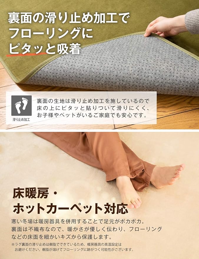 【滑り止めで転倒対策】tobestのカーペットの裏面には転倒防止や床滑り防止目的の滑り止めゴム付き。床面をカーペットが滑りにくく、カーペット上での転倒の危険性を最低限に抑制。【床暖房対応ラグ】tobestのラグは床暖房やホットカーペットに対応。ラグの裏面には高熱伝導率の不織布を採用。暖かさが伝わりやすくなっています。冷え込みやすい冬場の保温は勿論、冷房等で冷えやすい夏場でも活躍するラグです。