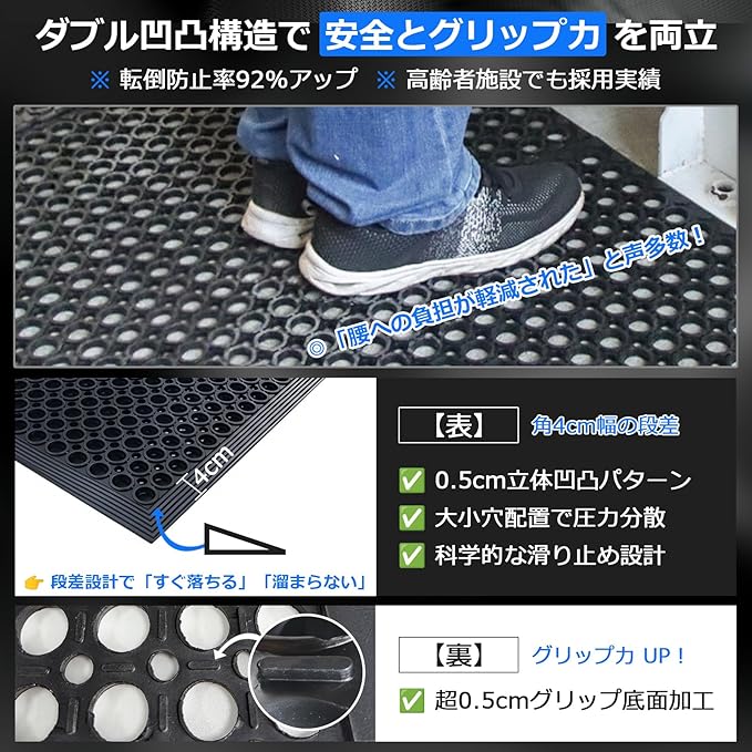 【滑り止め&安全設計】ダブル凹凸構造採用 0.5cmの立体凹凸パターン+グリップ底面で、濡れた場所でも抜群の防滑性。高齢者施設でも採用され、転倒防止率が92%向上との声も。