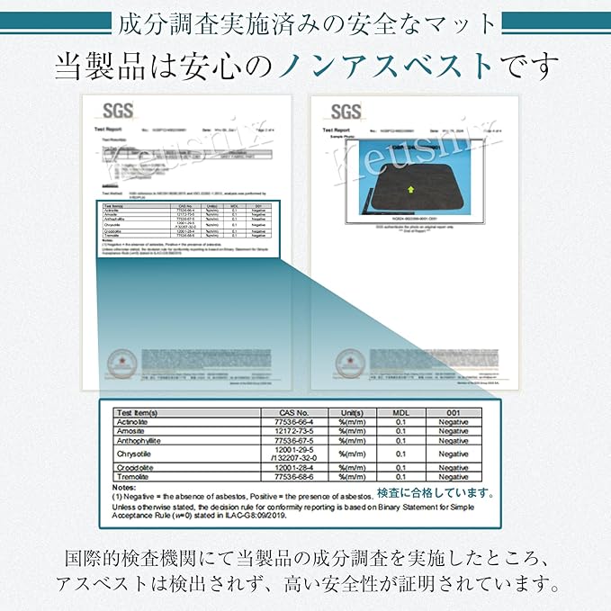 【SGS認証済・アスベスト不使用】本バスマットは、国際的な検査・認証機関であるSGSによる成分検査を受けており、アスベストは一切検出されていません。安全性の高さが確認された、安心してお使いいただける製品です。