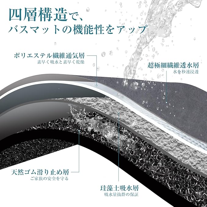 【珪藻土バスマットの4層構造】 ・超極細繊維の透水層:水分をすばやく浸透させる役割。 ・ポリエステル繊維の通気層:吸水・速乾性に優れた構造。 ・珪藻土の吸水層:本製品の吸水力の核となる層。 ・天然ゴムの滑り止め層:特殊な滑り止め技術を採用し、ご家族の安全を守ります。"