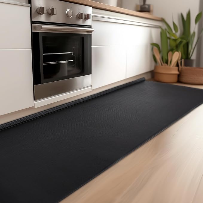 Gemarwel キッチンマット 拭ける【全ネット L字-折り目付き-床の隙間にピッタリフィット】 45x240cm 台所マット 6mm 分厚い 低反発 滑り止め 滑らない ふける 北欧 洗える 防炎 防寒 防音 撥水 PVC ポリ塩化ビニール おしゃれ かわいい 高級 ロング ブラック 無地