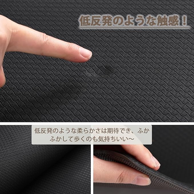 【踏み心地がいい】6mmの厚みで、足にかかる体重を分散し、素足で踏んでもクッション性があって、踏み心地がいいです。低反発のような柔らかさは期待でき、ふかふかして歩くのが気持ちいいです。ずっと立って洗い物をしても足が痛くなりません。腰への負担が少なく、長時間の調理が楽になります。物が落下しても衝撃を吸収し、床をキズやヘコミから守ります。