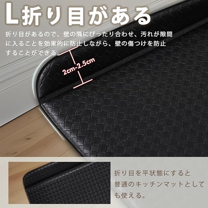 【L字タイプ-床隙間の汚れを簡単に処理できる】油汚れが壁の隅にこぼれる心配がない、L字キッチンマットは壁に当たる側は折目があり、隙間にぴったりフィットし、壁の隅に保護材を設け、隅の汚れを簡単に防止できました。汚れが広がったり隙間に落ちたりしても簡単に片付けられ、楽に隙間を掃除できます。