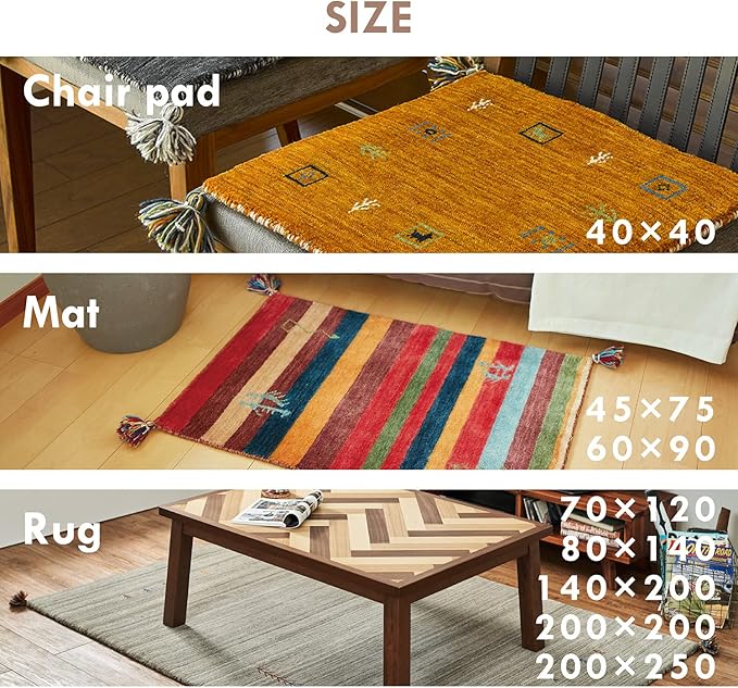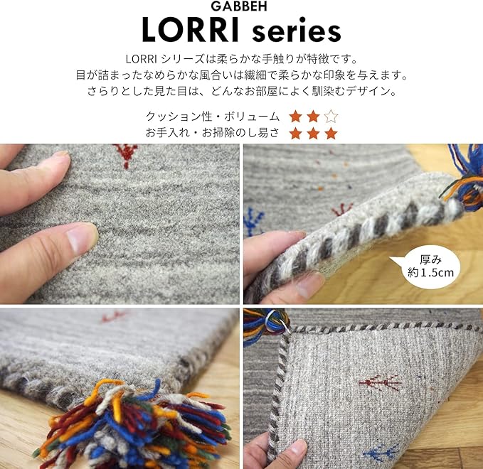 丁寧な手織り手法で使用時間の経過とともに味わいが深まる「ギャッベ」。ウール素材は暖かく冬に適しているイメージがありますが、温度差の激しい環境で育った羊から取れる羊毛(ウール)は、保温性と湿度を調節する機能に優れています。夏の湿気にも適しておりオールシーズンご使用いただける素材です。