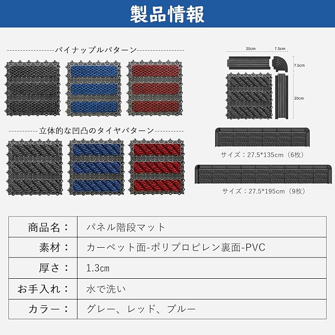 階段 滑り止めマット 屋外 玄関外マット 泥落としマット タイル 滑り止め 穴あき 泥除けマット ゴムマット 庭 階段 業務用 カーペット 防音 マッドガード 室外 厚手 転倒防止マット (27.5*135cm, パイ グレー)