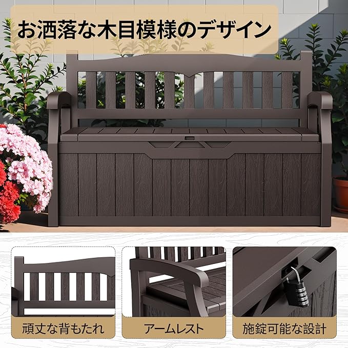 「ポリ樹脂素材・耐久性や防水性に優れ」:ベンチは厚手のポリ樹脂素材を採用し、耐久性、防水性、耐熱性に優れています。木製や金属製のストッカーと違い、朽ちるや錆びの心配がありません。優れた防水性で雨の侵入を防止し、収納物が濡れるのを防ぎます。UV耐候剤入りで紫外線で劣化しにくく、長い時間使っても色あせません。お手入れも便利で、汚れた場合は水洗いでOKです!