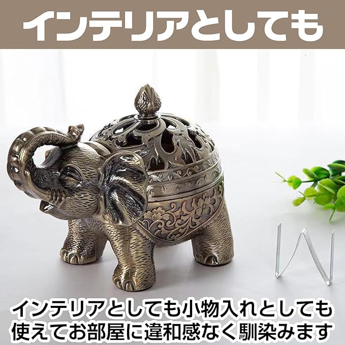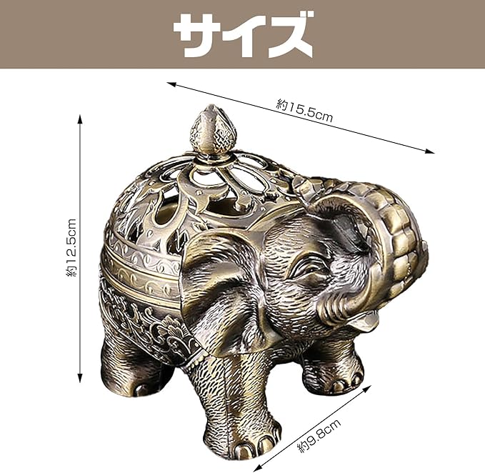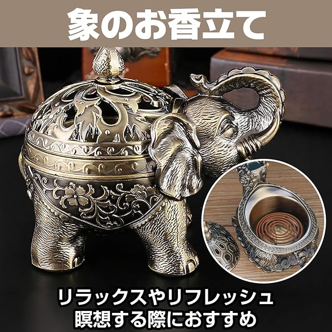 【象モチーフが空間に幸運を運ぶお香立て】エスニックテイストの象デザインが印象的なブロンズ仕上げの香炉です。合金素材を使用した重厚感のある造りで、おしゃれでかわいい象の表情が心を和ませます。高級感漂う仕上がりながらも親しみやすいデザインで、リビングや玄関に置くだけでエキゾチックな雰囲気を演出。風水では象は幸運の象徴とされており、お香の香りとともに空間に良いエネルギーをもたらし、毎日の生活に特別感を与えてくれます。【香立てで様々なお香に対応】香炉内部にはM字型の香立てが備わっており、渦巻き線香や線香を中央にしっかりと固定できます。灰がこぼれない設計により、お香を燃やした後の後片付けも楽々で、いつでも清潔に保てます。象の背中部分が香皿として機能し、燃え残った灰をキャッチするため、テーブルや畳を汚す心配もありません。仏壇用としても適しており、ご先祖様への日々のお参りもスムーズに行えます。【心と体を癒すリラックス空間の創造】ヨガや瞑想、読書タイムに活用することで、お香のアロマ効果とリラックス効果を同時に体感できます。寝室や書斎、オフィスに設置すれば、ストレス解消と集中力向上をサポート。お香の煙が空気を浄化し、消臭や虫除け効果も期待できるため、茶道教室や瞑想スペースでも重宝します。就寝前のひとときに使用すれば、一日の疲れを癒し、質の良い睡眠へと導いてくれる特別なアイテムとして活躍します。【贈り物にも喜ばれるインテリア雑貨】誕生日やクリスマス、母の日や父の日、新築祝いなど様々なシーンのプレゼントに最適です。動物置物としても楽しめるデザインで、アクセサリーや小物入れとしても活用可能な多機能性が魅力。象の温かみのある表情は老若男女問わず愛され、贈られた方の心に残る特別なギフトになります。インテリア雑貨としての価値も高く、受け取った方が長く愛用できる実用性も兼ね備えているため、心のこもった贈り物として喜ばれること間違いなしです。