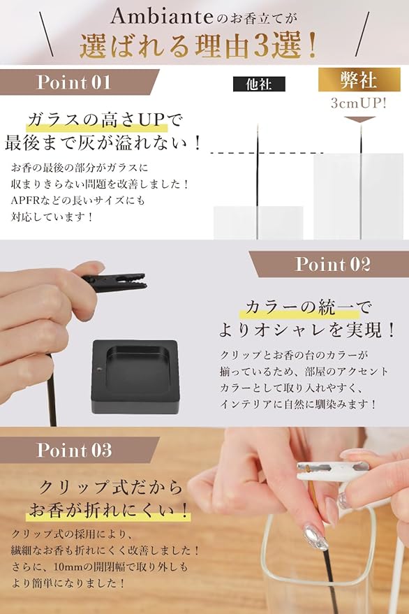 【多様なお香に対応】 クリップ型の構造により、さまざまなタイプのお香に対応可能。 ※線香タイプのご使用時は、熱によりクリップが変色する場合があります。また、お香を下向きに焚くタイプでは、クリップ部分にベタつきが生じることがあります。