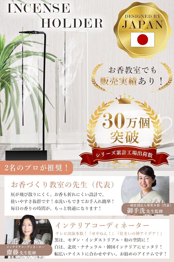 【W監修のお香立て】 お香教室を主宰するプロの香司と、テレビ出演経験もあるプロのインテリアコーディネーターの監修のもと商品企画しました。プロの専門知識を活かし、デザイン性とお香の焚きやすさを両立させた精巧な設計を実現。洗練されたデザインが空間に優雅な雰囲気をもたらし、幅広いインテリアに美しいアクセントを加えます。