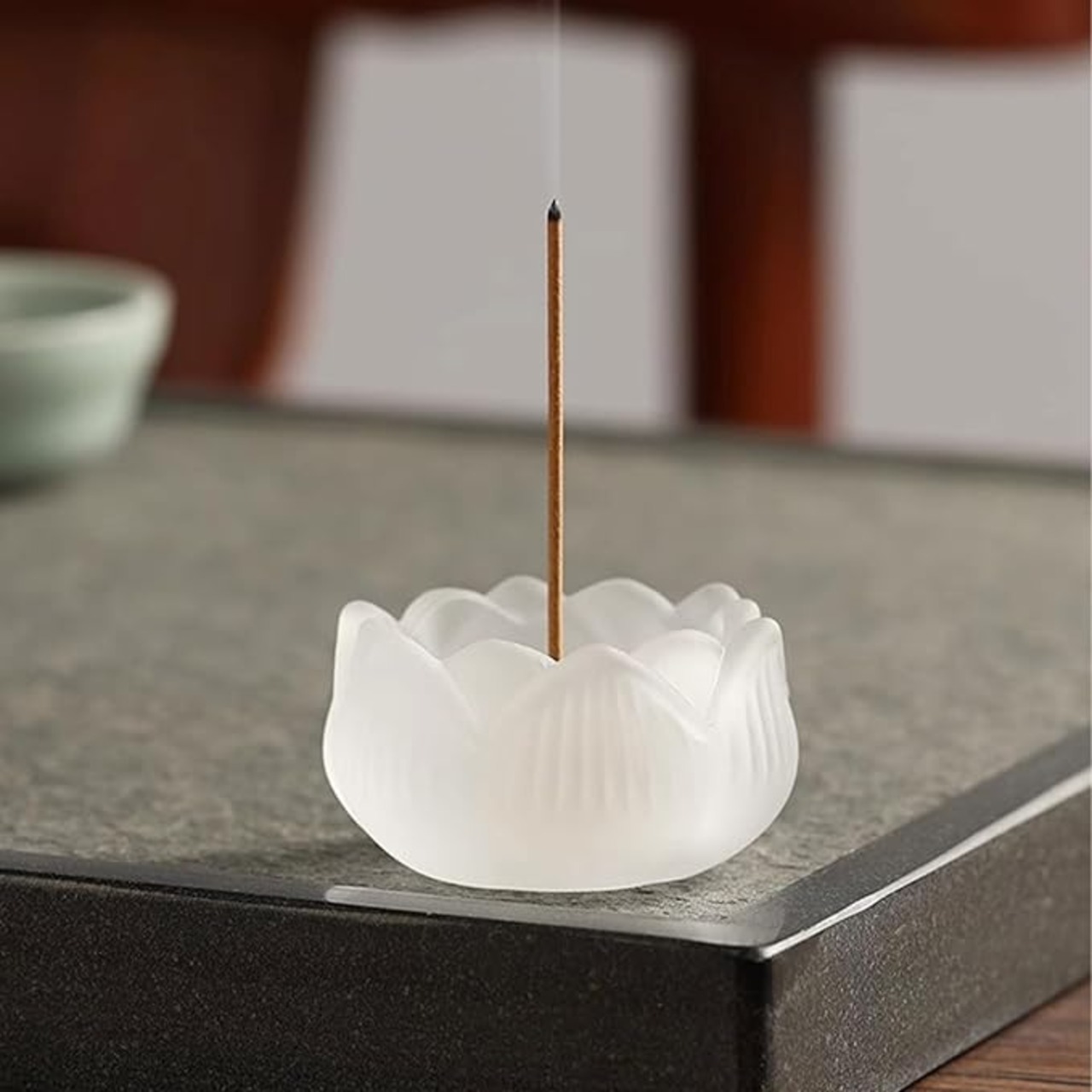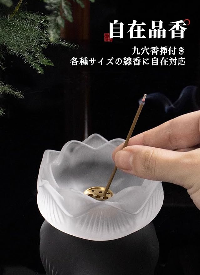 瑠璃製蓮デザイン: 職人手作りの瑠璃製で蓮の花をモチーフにした上品な香立て;和モダンなデザインがインテリアとしても映える