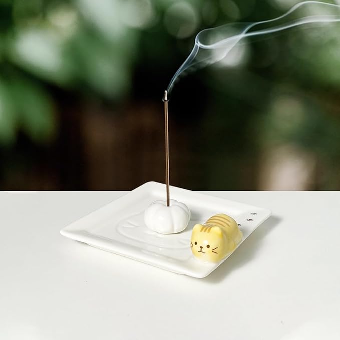 【デザイン】皿の縁でネコがうつぶせに眠っている姿は可愛くて面白い、皿の表面に猫の頭の形の溝があります。かぼちゃのお香立ては取り外し可能で、燃焼後の灰をブラシで片付けやすく、清潔にお使いいただけます。皿の底が滑らかに磨かれて、卓上に安定しています。