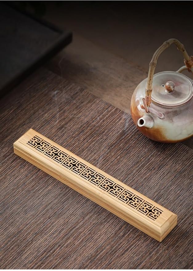 デザイン性: 伝統的な和風の透かし彫り模様が施された木製お香立て、3種類の異なる模様からお選びいただけます