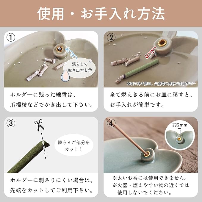【安定感のある陶器製】本体は適度な重みのある陶器製。本体と香立て部分は一体型なので、線香の重さで倒れる心配もなく、お手入れも楽々!ニュアンス系の淡いカラーがインテリアにも映え、置く場所も自由に選べます♪