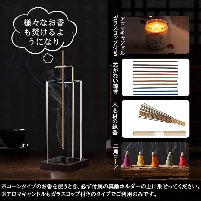 ❀【35cm以下の長香・短寸にも対応】こちらのインセンスホルダーの高さを大きく改良されましたので、市販の長めのお線香も折れなくて、直接ご利用することができました。ご愛用されるアポテーケ、ガーネッシュ、印度系の線香も対応できます。ガラスコップ両側の口径も大きく設計され、酸素の不足による火が途中で消える心配もありません。