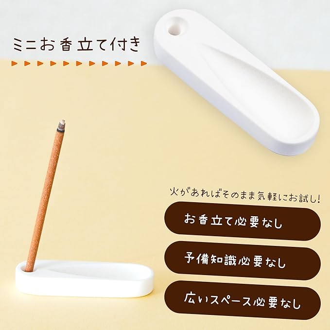 ミニお香盾付き。マッチやライターなどの火をご用意いただければそのまま楽しめます。お香立て、事前知識、広いスペースなど難しいことは必要なし。香りは画面越しで伝えきらないこそ、気軽にお試しできます。