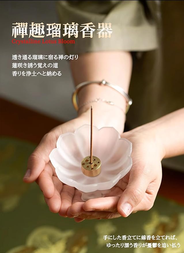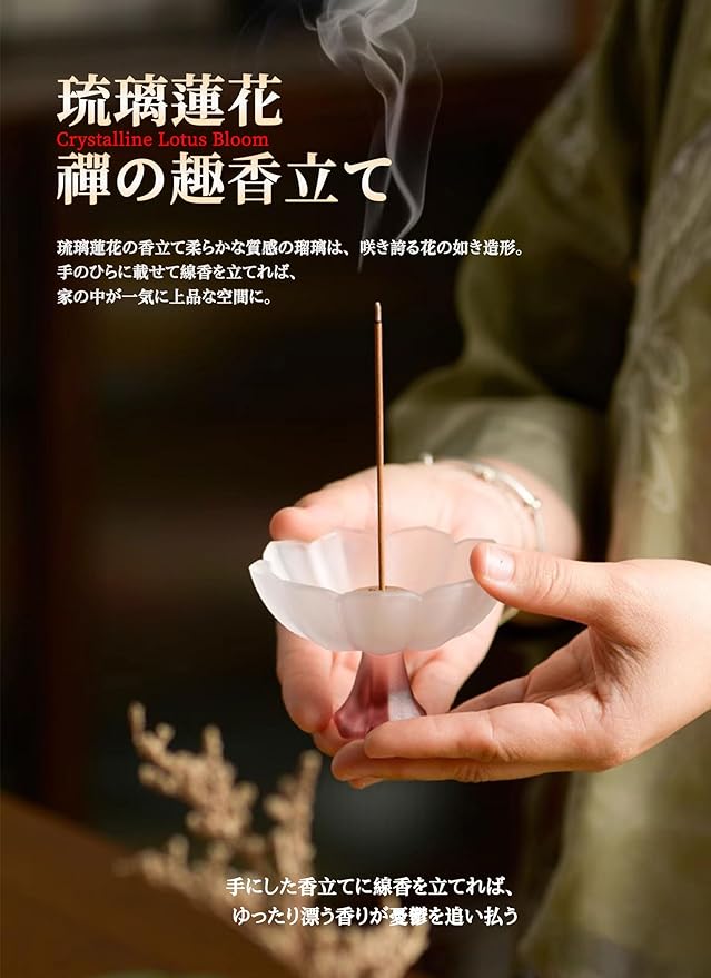 【独創的な瑠璃蓮デザイン】蓮をモチーフにした瑠璃製香炉。透き通る光沢と広がる花弁が東洋の繊細美を表現し、機能性と芸術性を融合。禅の精神を感じさせる上質な空間を創出します