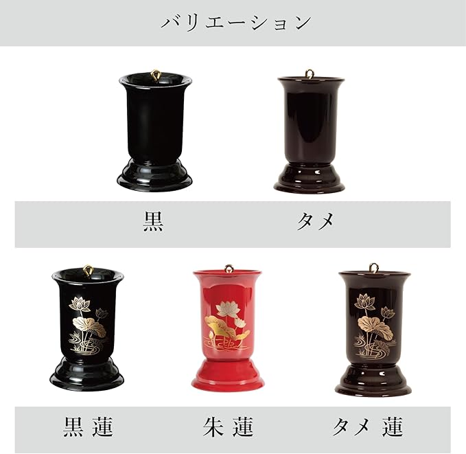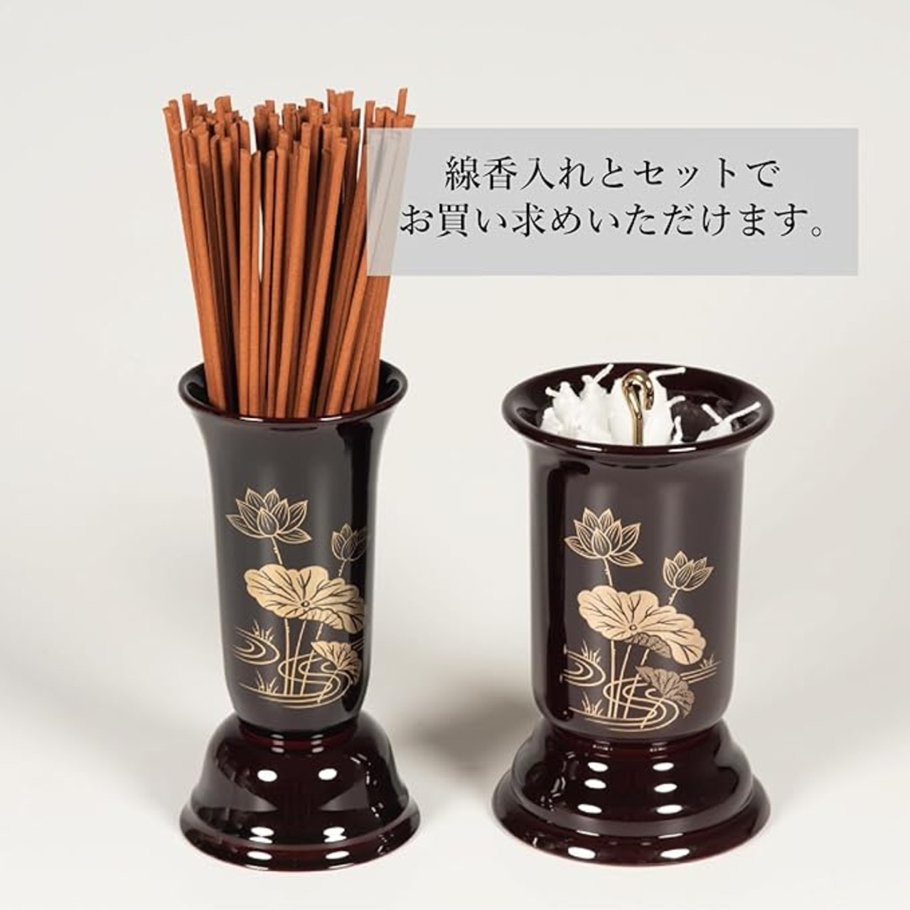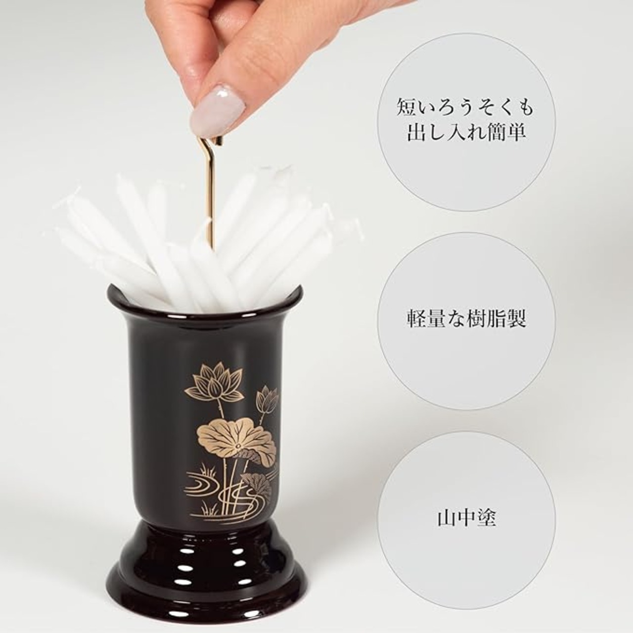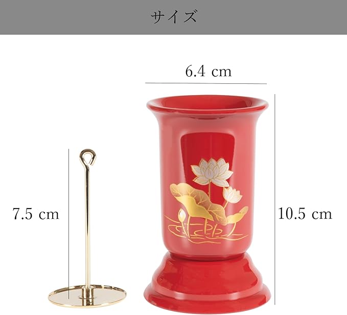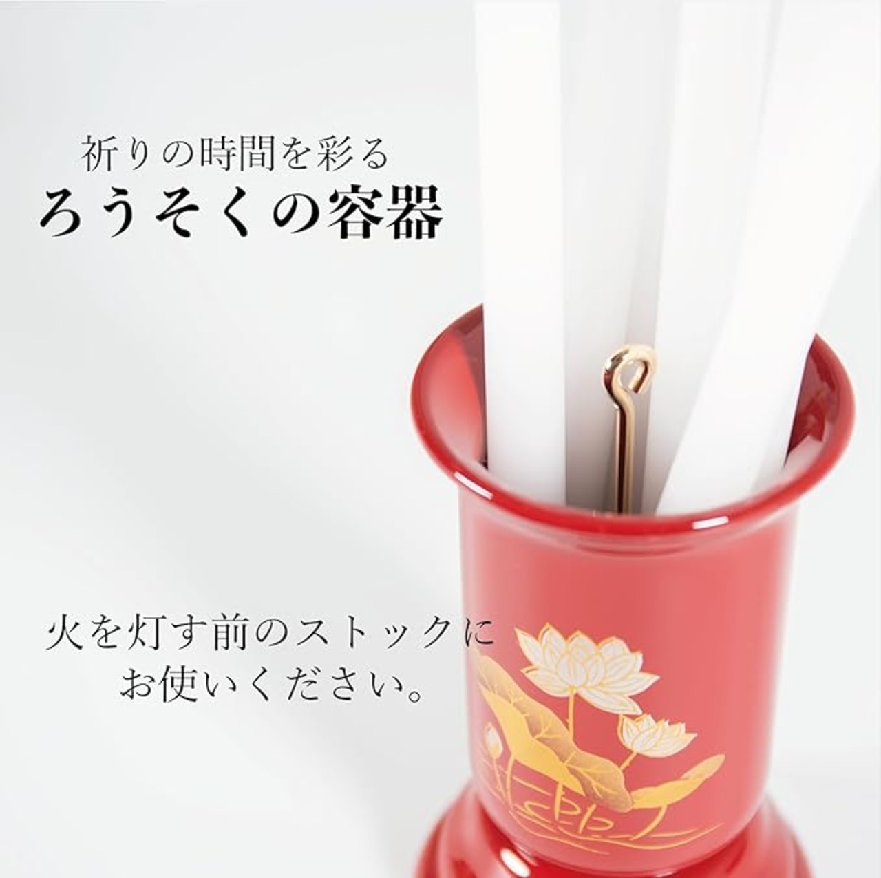 長いものから短いものまで、どの長さの蝋燭でも保管ができるローソク入れです。 朱色(赤)の本体に、金色で蒔絵を施しました。煌びやかな蓮のレリーフが、お仏壇で輝きます。 朱色の塗装や金色の蒔絵は、日本の職人によるもの。1点1点 丁寧に仕上げております。 直径6.4 10.5cm。一般的なお仏壇にも、小さなお供えスペースにも置くことができます。 軽量な樹脂(プラスチック)製のローソク入れです。不意に落としても割れや欠けの心配はありません。