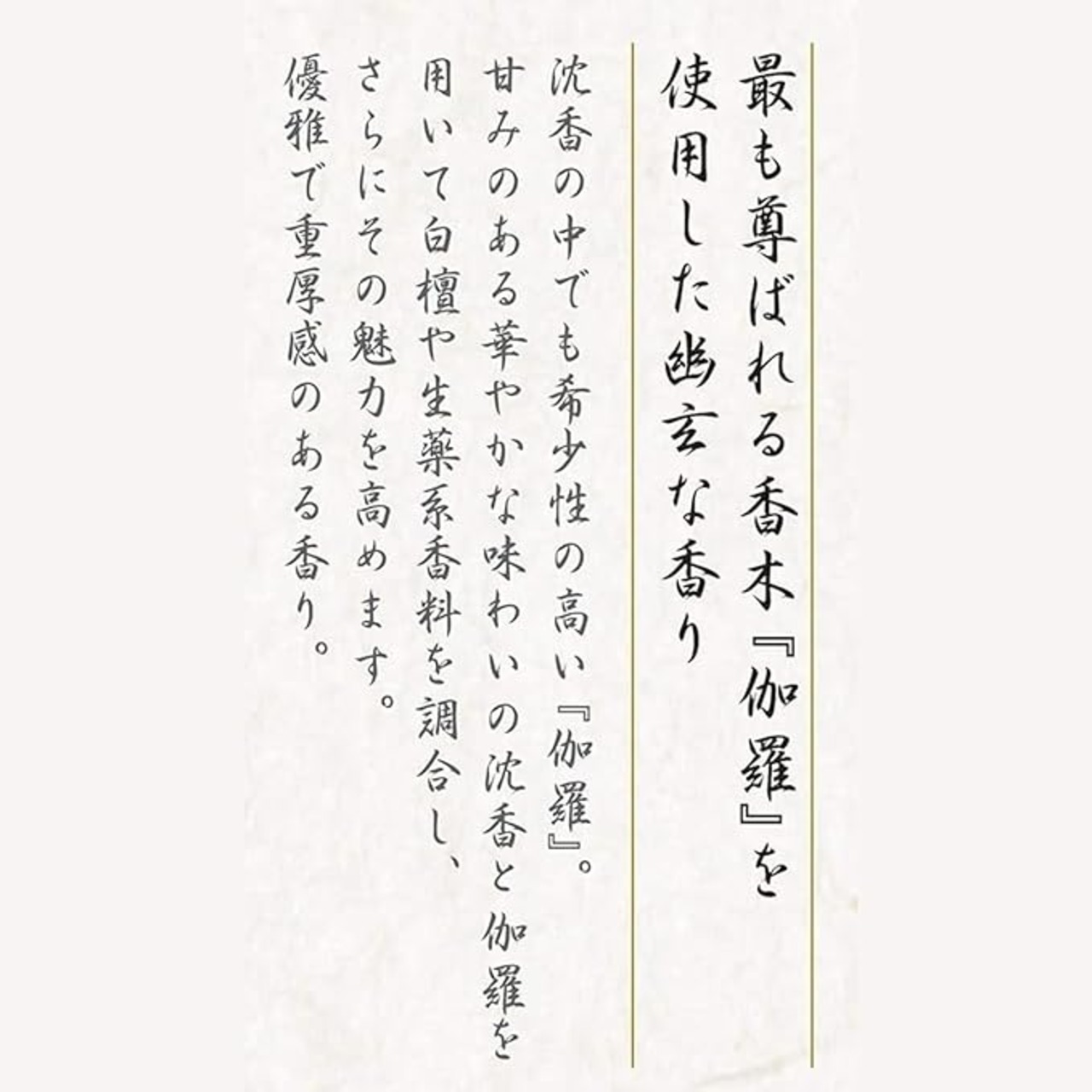 甘みのある華やかな味わいの沈香・伽羅を豊富に用い、白檀・生薬系香料を調合しております。優雅で重厚感のある香りです。穏やかにお部屋に香りが漂います。 商品サイズ:高さ68mm 幅100mm 奥行24mm 箱含む重量:約68g 燃焼時間:約13分 セット内容(成分): タブ粉、香料