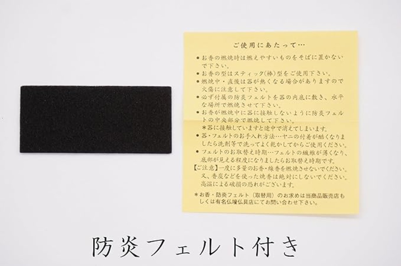 使用にあたって。お香の燃焼時は燃えやすいものをそばに置かないでください。燃焼中・直後は器が熱くなる場合がありますので火傷に注意してください。必ず付属の防炎フェルトを器の内底に敷き、水平な場所で燃焼させて下さい。お香が燃焼中に器に接触しないように防炎フェルトの中央部分で燃焼して下さい。(器に接触していますと途中で消えてしまいます。)器・フェルトのお手入れ方法、ヤニの付着が酷くなりましたら洗剤等で洗ってよく乾かしてからご使用下さい。また、フェルトのお取替え時期はフェルトの繊維が薄くなり、底部が見える程度になりましたらお取替え時期です。また、一度に大量のお香・線香を燃焼させないでください。また、香炭などを使った焼香は絶対にしないでください。高温による破損の恐れがございます。