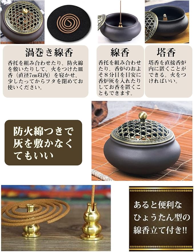NGE香炉 お香立て 陶器 真鍮の蓋付き おしゃれ シンプル 難燃綿と香立てつき アロマ・コーン・スティック線香に対応 手入れ簡単 アジアン リラックス 癒やし ヨガ 瞑想 浄化 香道 仏具 仏壇用 インテリア アンティーク 丸香炉