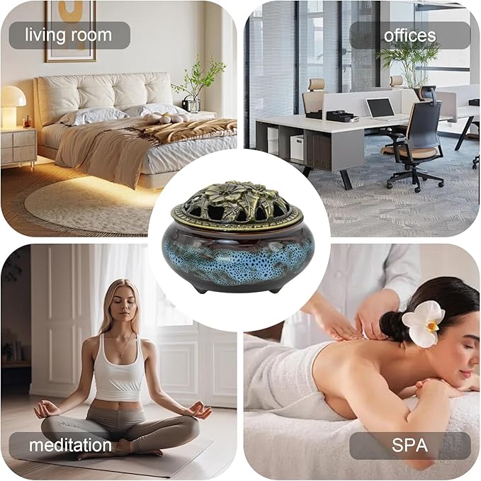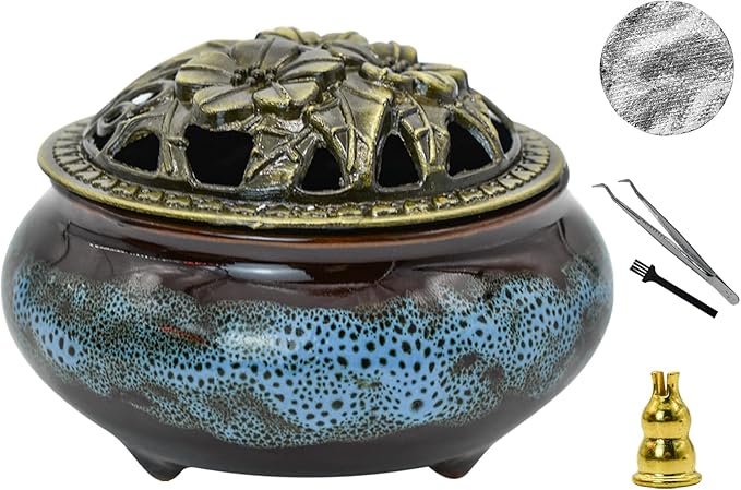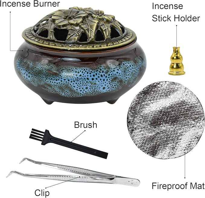 高級感あり:線香立ての外観は非常に古典的で、窯変青、窯変灰、窯変赤、窯変黄の4つの色があります。特殊な技術を使って、表面は不規則な黒色が散らし、上部には金属色の蓋と合わせ、全体的に高級感があります。お香たての下には3本の丸い脚が立っていて、安定していて美しいです。