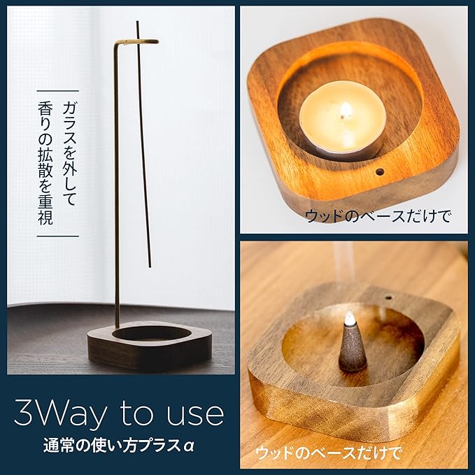 【3WAYS】ガラスの筒を外して吊るすだけの使い方や、ウッドのベースだけを使用しコーンタイプや渦巻きタイプのお香も快適に使用できます。