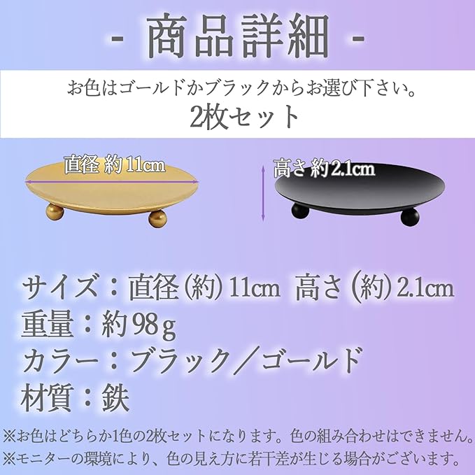 【商品詳細】セット内容:2枚 サイズ:直径約11cm 高さ約2.1cm 重量:約98g カラー:ブラック/ゴールド 材質:鉄