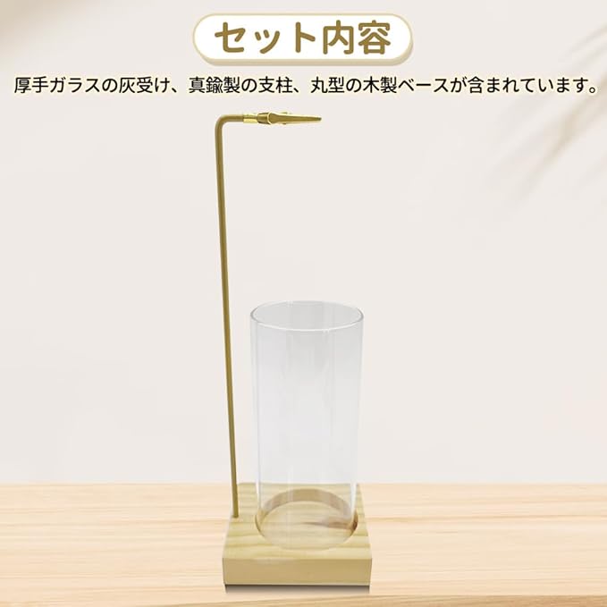 【セット内容】厚手ガラスの灰受け、真鍮製の支柱、丸型の木製ベースが含まれています。