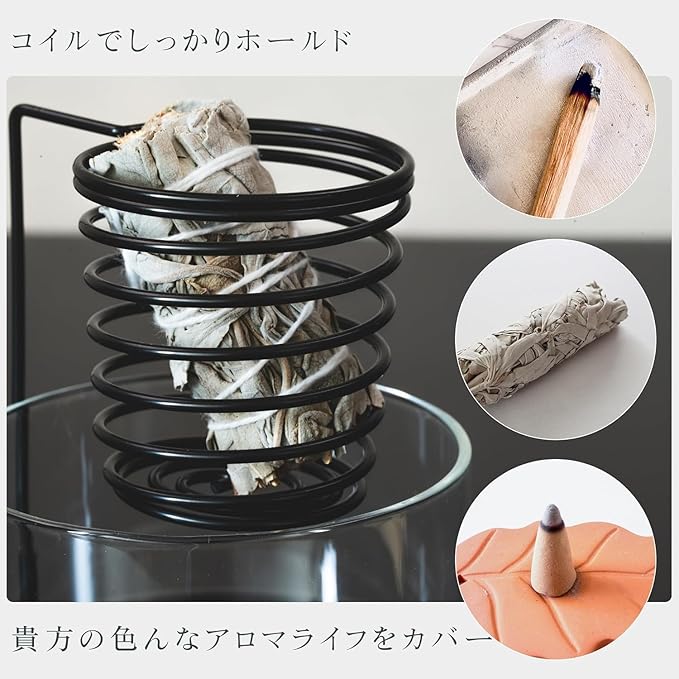 【サイズ】 本体 / 10cm 11cm ホルダー径 / 4cm 素材 : ガラス、金属 【洗練された北欧テイストデザイン】モダンな部屋づくりにも似合う、シンプルで洗練された北欧テイストのデザインです。アジアンテイストとはまた違う、無機質ながらスタイリッシュでスマートな雰囲気を演出できます。 【汎用性の高い、バケット型コイルホルダー】ワイヤーをコイル状にシェイプしたバケット型のホルダーなのでパロサントはもちろんのこと、ホワイトセージワンドやお香など様々なアロマを焚くことができます。貴方のアロマライフに柔軟に対応。 【風が吹いても灰がこぼれない】従来の受け皿などはお皿の上で香源を焚いて灰を下で受けるものが多く、構造上皿の上に灰が溜まります。風が吹くとどうしても灰が飛び散って部屋を汚してしまうことになりかねませんでした。そこでガラスのトレイの中に灰を落とす構造にすることによって深いトレイに灰が溜まり、風が吹いても飛び散って部屋が汚れることもありません。窓際などに置いて穏やかな風に香りをのせて楽しむこともできます。
