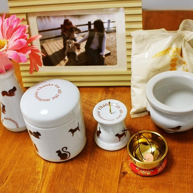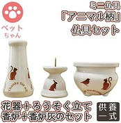ペット仏具 ミニ仏具 3点セット アニマル柄 花器 香炉 ろうそく立て ブラウン 香炉灰 つき