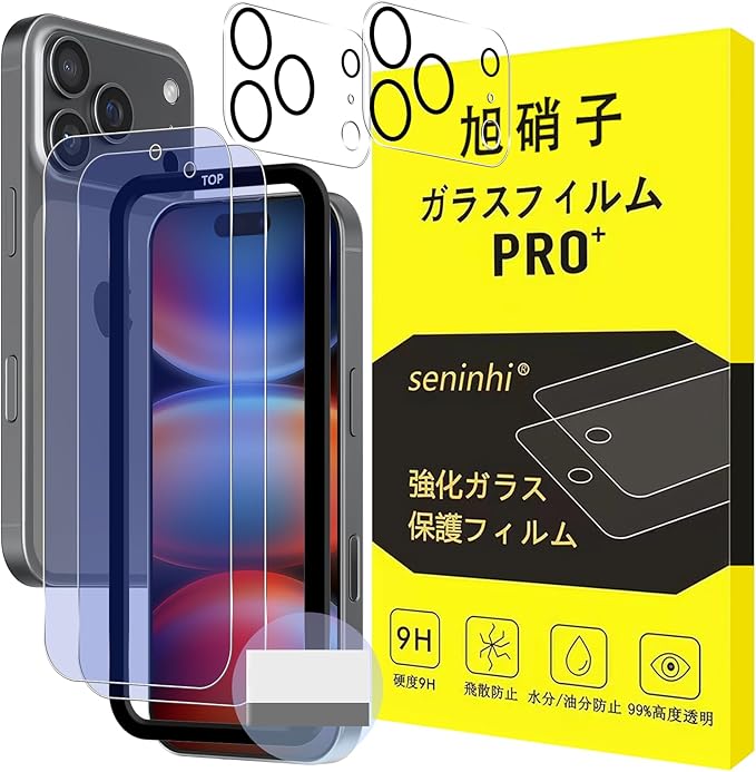 対応 iPhone 17 Pro ガラスフィルム ガイド枠付き【 ブルーライトカット】アイフォン 17 pro 【2+2枚 セット-日本旭硝子製-高 品質】いpほね 17 プロ 強化フィルム(2枚入り) + レンズフィルム(2枚入り)+ ガイド枠(1枚入り) 液晶保護 強化ガラス 硬度9H 3Dラウンドエッジ加工 高透過率 自動吸着 気泡ゼロ スクラッチ防止 飛散防止 衝撃吸収 撥油性 指紋防止 超高タッチ感度 アイスブルー SENHFL-IP17PRO-LGM