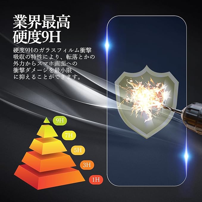 【9H硬度 飛散防止】:業界最高表面硬度9Hのガラスフィルムで、日常の様々な物質からスマートフォンを守ります カバンの中の鍵や小銭、砂利や砂など日常の様々な傷から守ります。万が一フィルムが破損した場合でも、破片が飛び散りない、破片によっての画面や人を傷つける心配がありません
