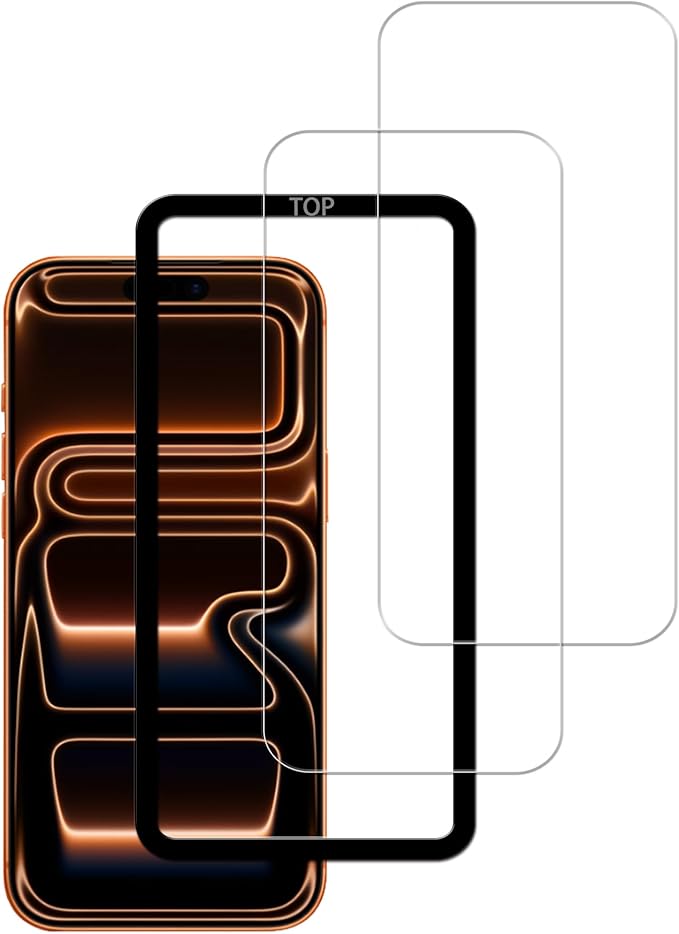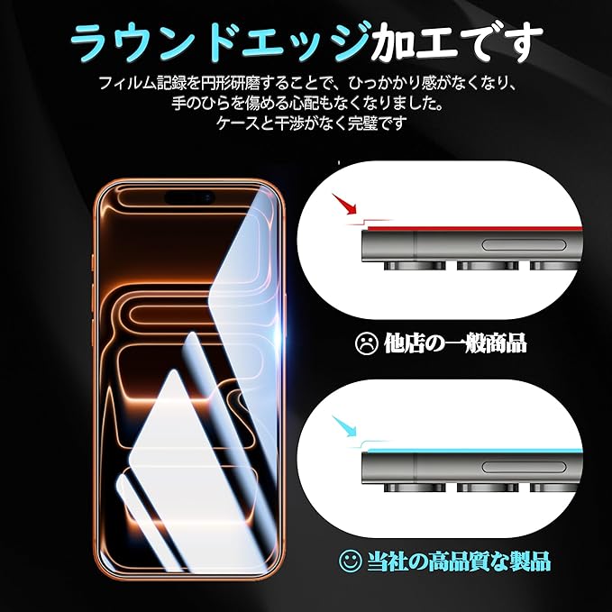 【対応機種】iphone 17 Pro ガラスフィルム2枚 。【注意】この電話の画面の端は湾曲しているため、保護フィルムのサイズが丁度良い場合、しっかりと貼り付けられず、白いエッジやシェルとの干渉などの問題があるため、保護フィルムは画面よりも小さいです。