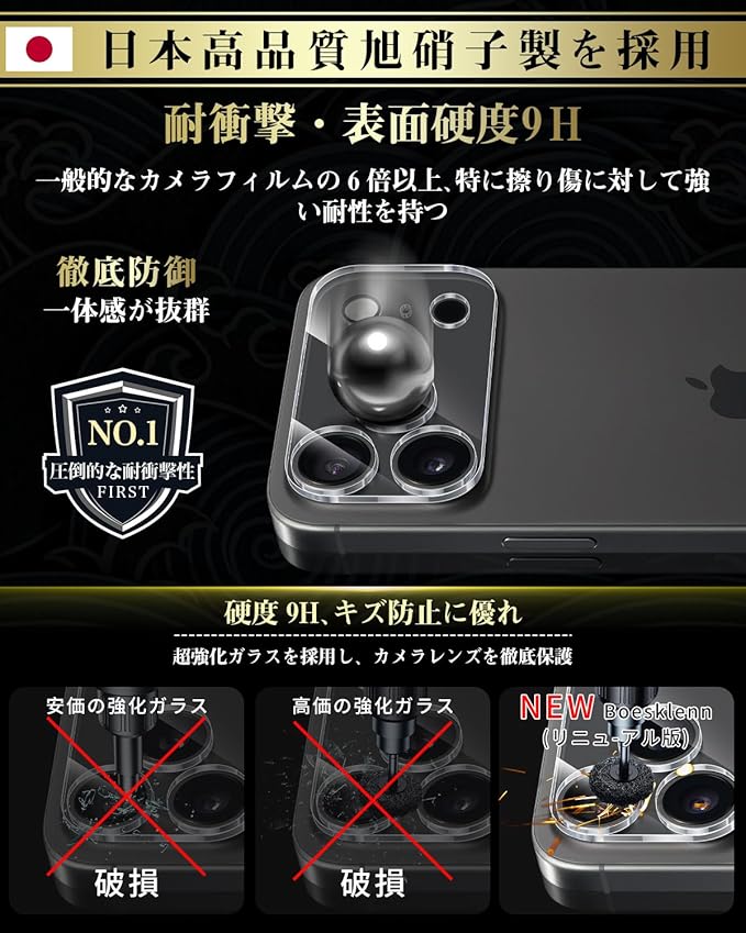 Boesklenn 対応 iPhone 17 Pro Max カメラフィルム 対応 iPhone 17 Pro Max レンズカバー 日本旭硝子素材製・硬度9H・全面保護・耐衝撃・高透過率・露出オーバー防止・ケースに干涉なし 17 Pro Max カメラ保護カバー【2枚入り】