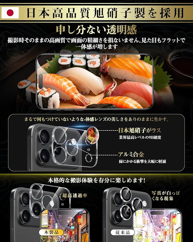 2⃣【日本製素材旭硝子製!超高硬度9H・飛散防止!】高いの光通過率を持っていて、フィルムを貼ったままでもトリプルレンズカメラの広がる表現力と細かな性能が全て対応できるので、撮影時に画質をそこなわなくて、被写体の微細な質感までを忠実に再現します。旭硝子を採用し、丈夫な素材と剛性の高い構造で。硬度9Hのため鋭利なものが当たっても傷が付きにくいことが特徴です。それ以外特別の飛散防止や、ナノメッキコーティング、ポリエチレン コーティングなど五重コーティング加工技術施します。特殊な飛散防止設計により、万一割れてしまった際にもガラス片が飛散することなく、高い安全性を実現しています。