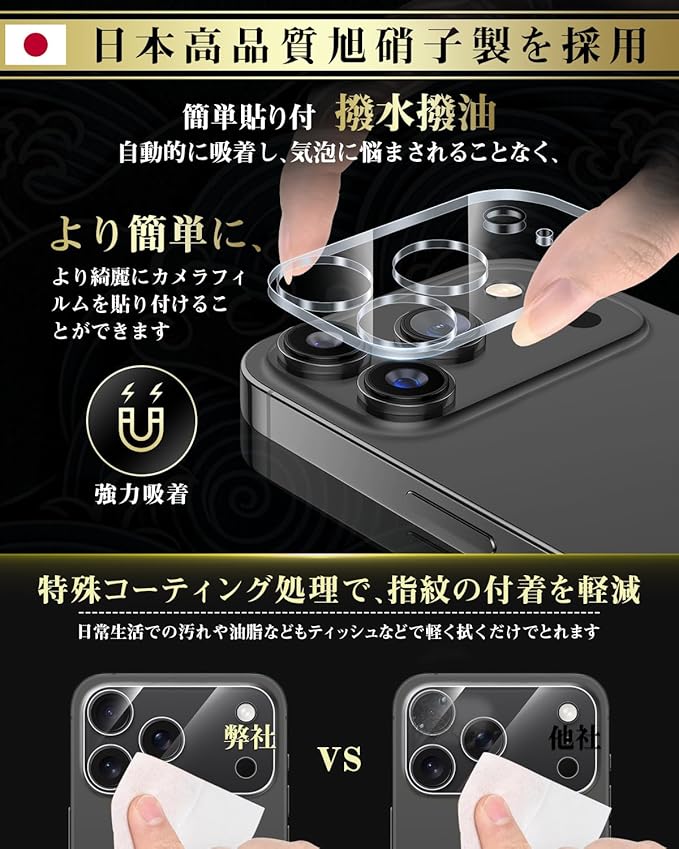 3⃣【全面保護!防塵効果】ガラスカメラフィルムは大切な17 Pro maxを全面保護するため、3眼のレンズ部分だけではなく、台座部分も全方位カバーで、剥がれにくくて全面保護できます。広い面を覆うため、カバーの密着度合いが非常に高くて、レンズのみのカバーと比較して防塵効果も高くて、ホコリが入りにくい構造です。