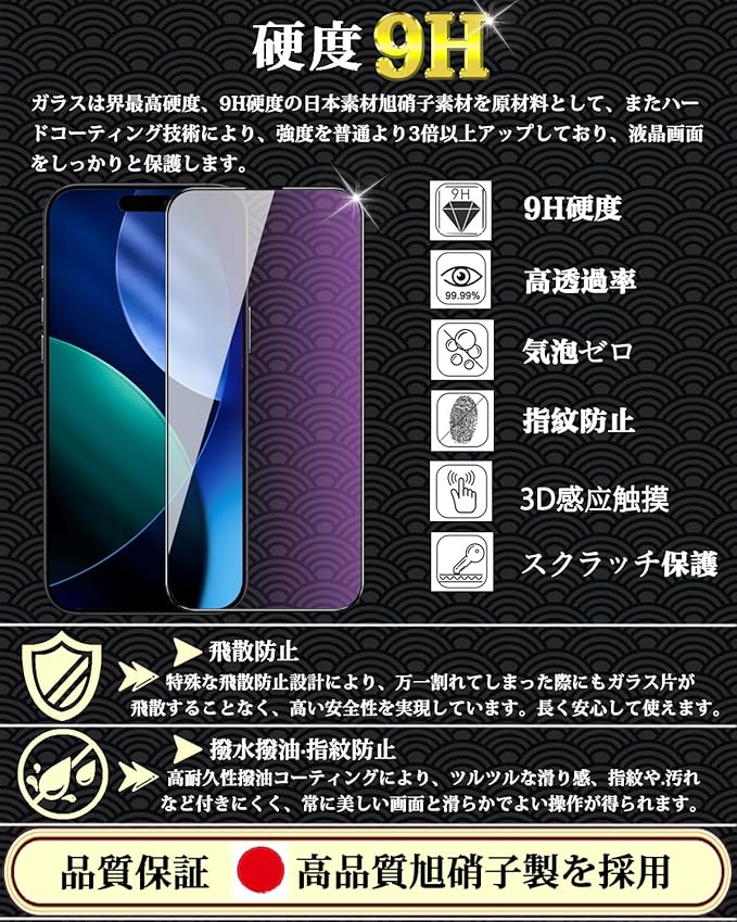 【表面硬度9H!飛散防止】日本製素材旭硝子製を採用しております、高品質な素材で衝撃を緩和し画面の破損を最低限まで抑えます。9H硬度で、ハードコーティング技術により、衝撃を緩和し画面の破損を最低限まで抑え、すり傷や指紋からもスクリーンをしっかりと保護します。