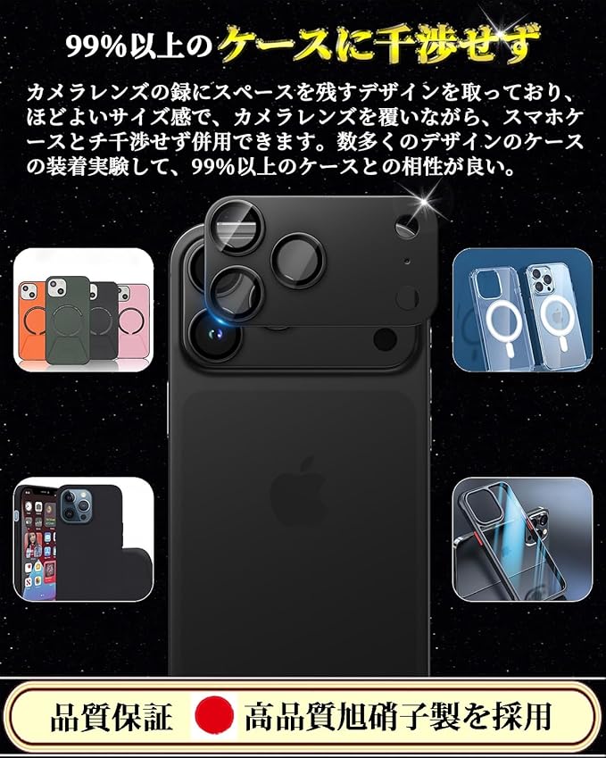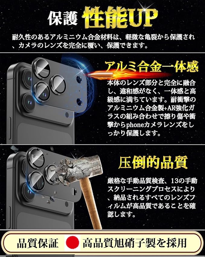【耐衝撃!対応機種】iPhone 17 Pro Max 専用 カメラフィルム 露出オーバー防止。アルミニウム合金枠と9H硬度の強化ガラス素材を採用することにより、外部からの衝撃を最大限にカットし、レンズ割れを徹底防御する耐衝撃の強化カメラ保護ガラスフィルムです。 落下などによる衝撃を防ぎ、保護機能を更に強化させます。飛散防止処理をされて、万一がガラスフィルムが破損した際にも、破片を飛び散らないので、安心にご利用いただけます。