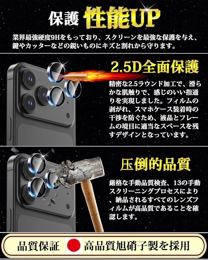 【超薄!高透過率】レンズ部分は直接触れないように0.26mmの精密加工で、何も貼っていないような感じ。カメラの使用に影響を与えません。99%以上の高透過率で、元のカメラの鮮明度を損なうことなく画面本来の美しさをそのまま表現。カメラレンズを保護することができますし、写真を撮ることにも影響しません。