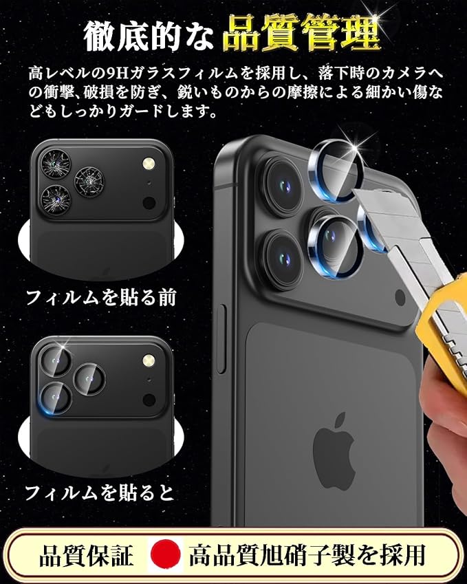 【対応機種】iPhone 17 Pro / 17 Pro Max 用 カメラフィルム 露出オーバー防止。精密加工により、透明なアクリルリングとガラスで、レンズに溶け込むような一体感。カメラ保護フィルムは、貼り付けてもカメラレンズより0.26mmほどしか高くならないため、カメラレンズそのままで使っているような自然なデザインです。