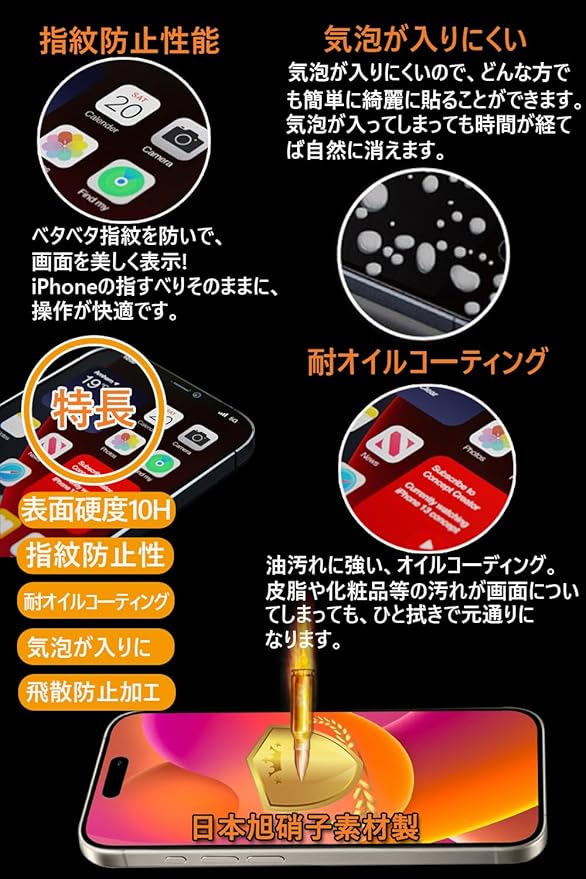 【快適なタッチ感!指紋防止 撥水撥油技術】真空蒸着技術を利用し、表面にナノコーティングを採用し、指紋防止薄膜を形成することで、滑らかであると同時にパワフルな耐油汚れ・汗染み・指紋性能を備え、汚れ防止効果はより長く持続でき、頻繁にスマホを拭く悩みがなくなります。