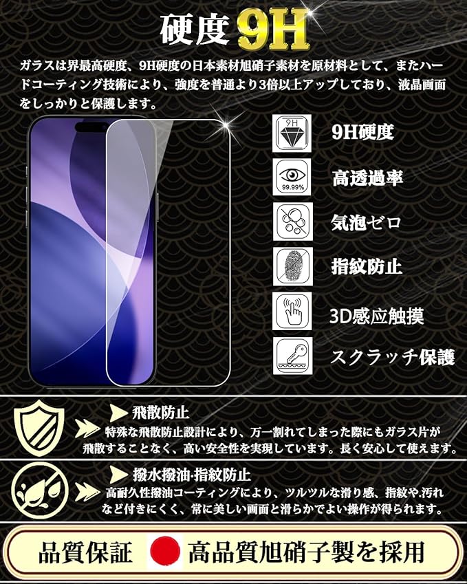 特徴 9H表面硬度,飛散防止,防指紋,撥油コーティング,撥水剤,耐衝撃性,ラウンドエッジ,気泡なし,高透過率,簡単貼り付け