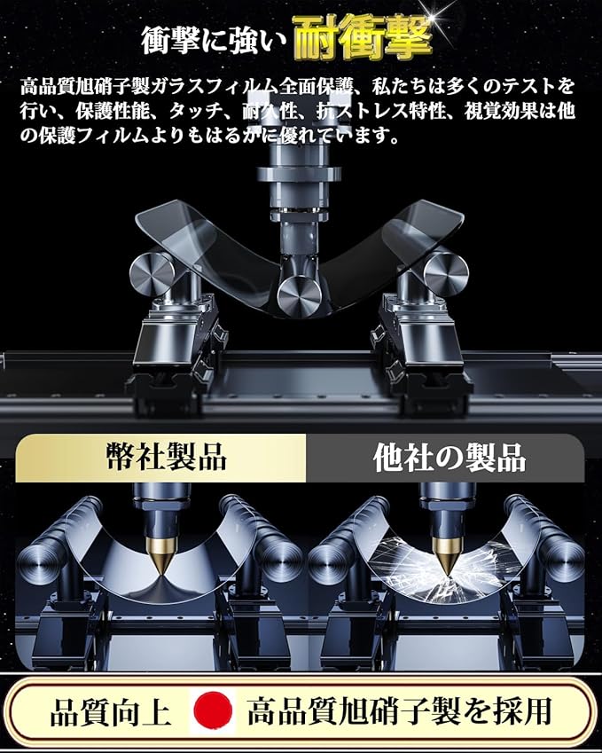 【旭硝子素材採用】日本製素材旭硝子製を採用しております、高品質な素材で衝撃を緩和し画面の破損を最低限まで抑えます。高品質製品の製作プロセスに厳しく基づき、ガラス420 高温強化時間6時間、め七つのステップを経てスマホに完璧的にフィットした製品を製造されます。
