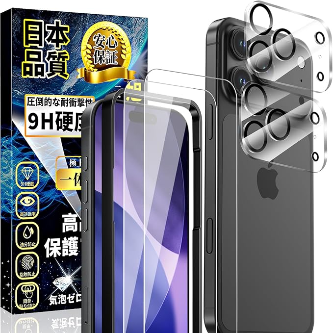 対応 iPhone 17 Pro ガラスフィルム(2枚)+アイフォン17 Pro カメラフィルム(2枚)【旭硝子素材製-4枚入り】硬度9H 指紋防止 気泡防止 自动吸着 高透過率 飛散防止 iPhone 17 Pro レンズカバー + 強化ガラス + ガイド枠